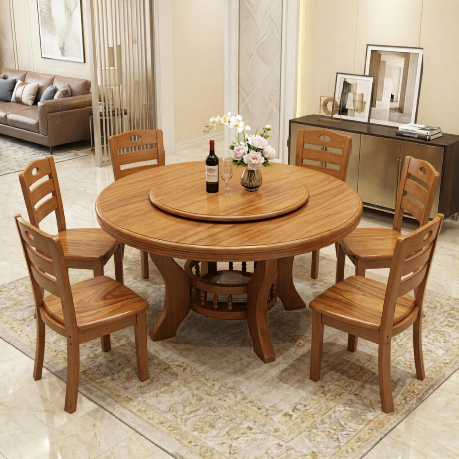 Bộ Bàn Ăn Phòng Bếp Gỗ Gõ Đỏ Mâm Xoay Chân Cong Nghệ Thuật